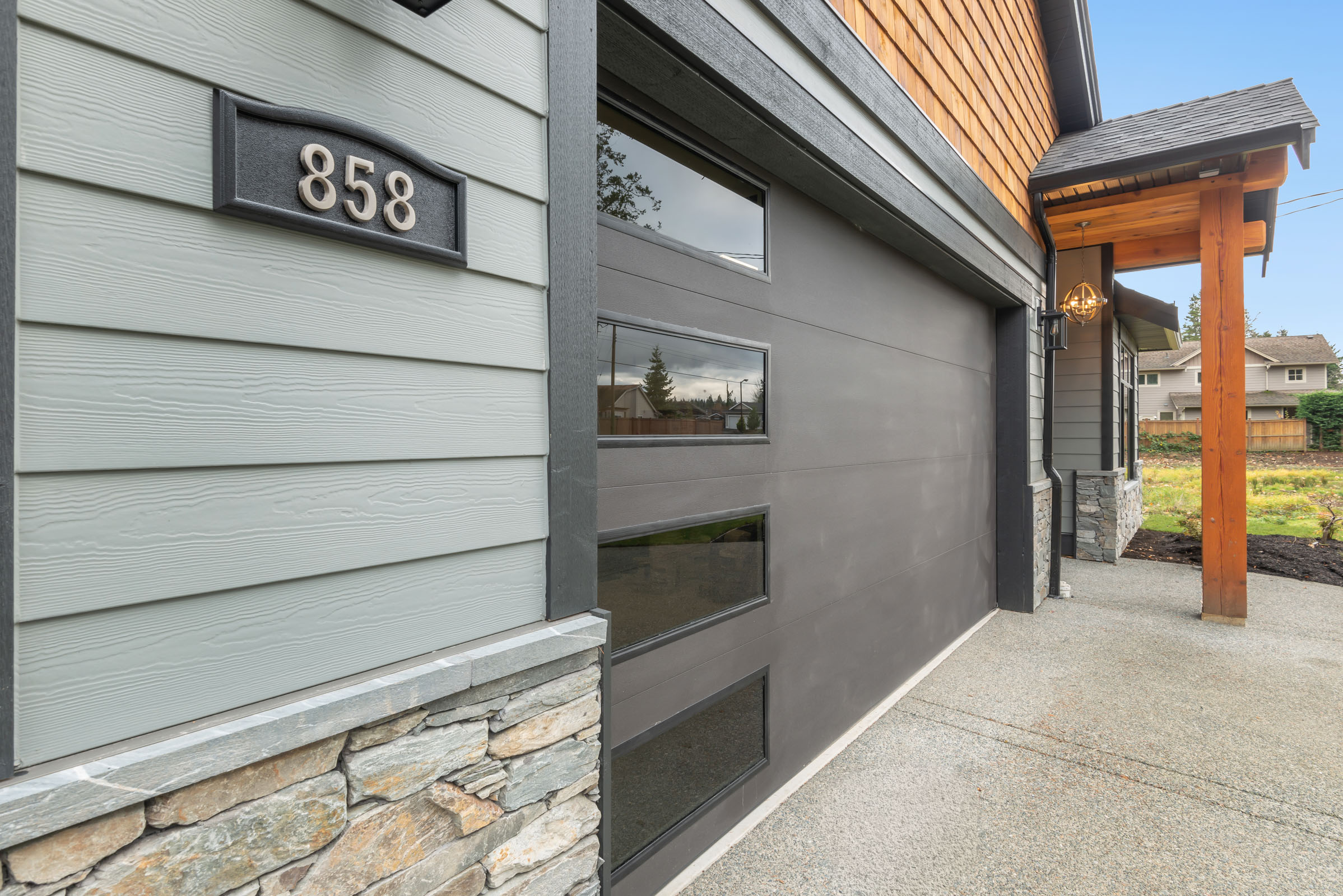 - Natural stone accents, solid timber posts and beams with a covered stamped patio